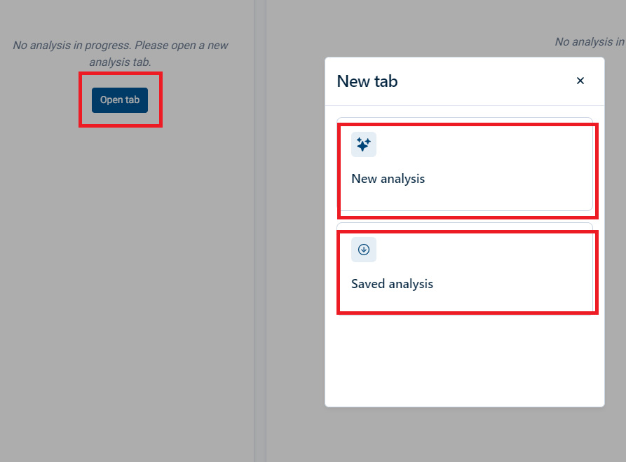 2. Click on "Open tab", then on "New analysis" to start configurating an analysis. Otherwise, choose "Saved analysis" to access a previously saved analysis. If you select "Saved analysis", you can skip to step #5.