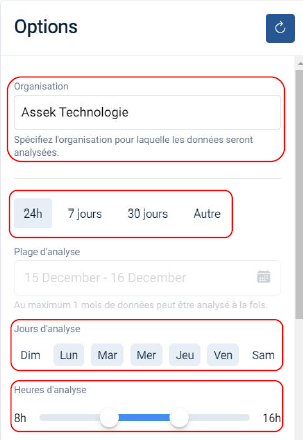 4) Dans le menu d’options à gauche de l’écran, choisir l’Organisation ou la sous-Organisation à analyser. Puis choisir la plage, les jours et les heures d’analyse désirés.