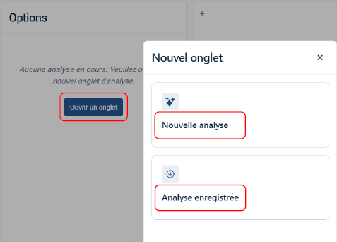 2) Cliquez sur « Ouvrir un onglet », puis sur « Nouvelle analyse » pour commencer à configurer une analyse. Sinon, choisissez « Analyse enregistrée » pour accéder à une configuration d’analyse déjà enregistrée. Si vous sélectionnez « Analyse enregistrée », veuillez vous référer directement à l’étape 7).