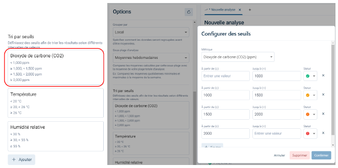 6) En cliquant sur une case du tri par seuils, il est possible de modifier les valeurs par défauts. De plus, lorsque l’analyse est complétée, la section tri vous permet d’afficher et d’exporter spécifiquement les locaux en fonction des seuils sélectionnés.