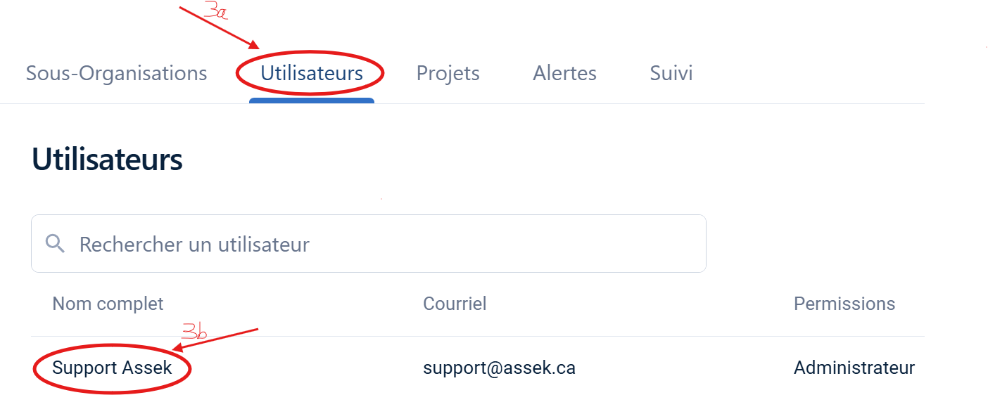 3) Cliquez ensuite sur l'onglet Utilisateurs(3a), puis sur l'utilisateur (3b) dont vous voulez supprimer les droits d'accès.